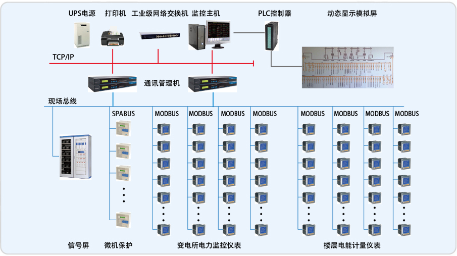 系統組網采用常見的3層結構,站控管理層、通訊管理層和現場設備層。上位機軟件采用Acrel – 2000電力監控軟件,通過軟件進行設備配置、數據庫變量配置、界面設計等,完成了在上位機軟件監控及電力監控的功能。具體如下: