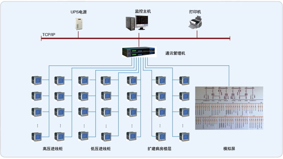 甘上海華山醫院病房樓是一幢醫用建筑,建筑面積約為2萬平方米。根據配電系統管理和能耗監測的要求,需要對樓內的高壓進線、低壓配出線和各樓層內配電箱進行電力監控,以保證用電的安全、高效。