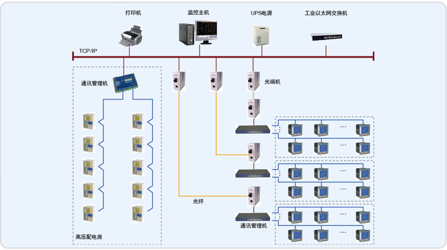 系統采用分層分布式結構,在高壓配電房設置一臺4口的通訊管理機,采用RS485總線將網絡儀表接入通訊管理機,直接與交換機相連,進行數據上傳;在每個低壓配電室設置一臺16口通訊管理機,采用RS485總線將網絡儀表接入通訊管理機,再通過光纖傳輸,將采集的所有現場設備的數據傳至監控主機,實現遠程電參量實時監測。