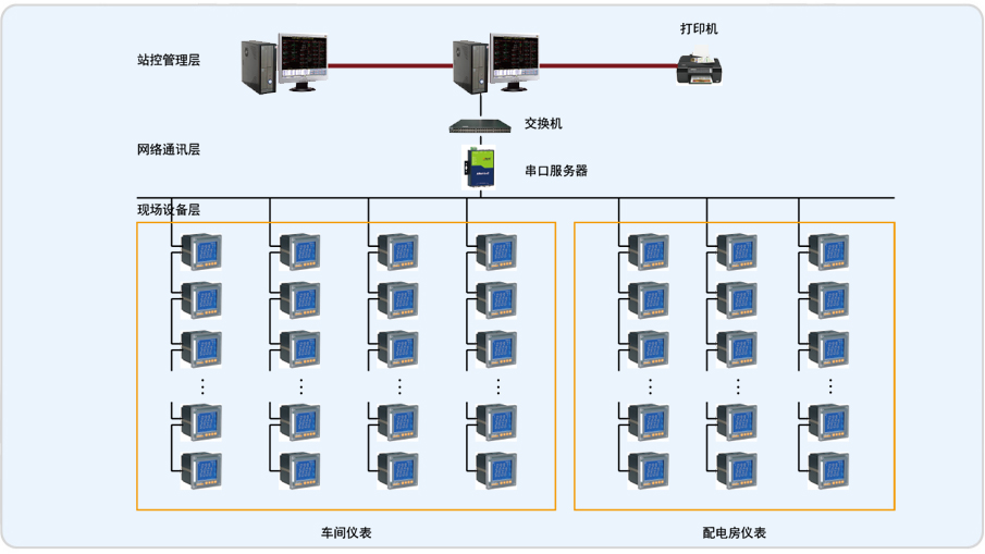 整個低壓配電系統包括20個低壓配電柜。其中三個進線柜,三個電容補償柜,兩個母聯和12個出線柜,12個出線回路的負載基本上是三相大功率電機。各配電柜內安裝有本公司PZ80L-E4/C 儀表共80只。整個系統分11根總線接入工業級串口服務器,組網至電力監控系統。