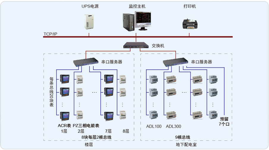 黑龍江省大豆乳品研發(fā)中心電能管理系統(tǒng)的監(jiān)控范圍為地下二層配電間采用的ACR網(wǎng)絡(luò)電力儀表和PZ三相電能表共182臺(tái),地上八樓層配電箱采用的ADL100和ADL300導(dǎo)軌式電能表共321塊。系統(tǒng)應(yīng)用分布式網(wǎng)絡(luò)結(jié)構(gòu),采用32根屏蔽雙絞線將設(shè)備層的儀表連接至通訊層的兩臺(tái)16口串口服務(wù)器,又通過TCP/IP將數(shù)據(jù)上傳至監(jiān)控層的工業(yè)計(jì)算機(jī)進(jìn)行采集、分析、存儲(chǔ)。