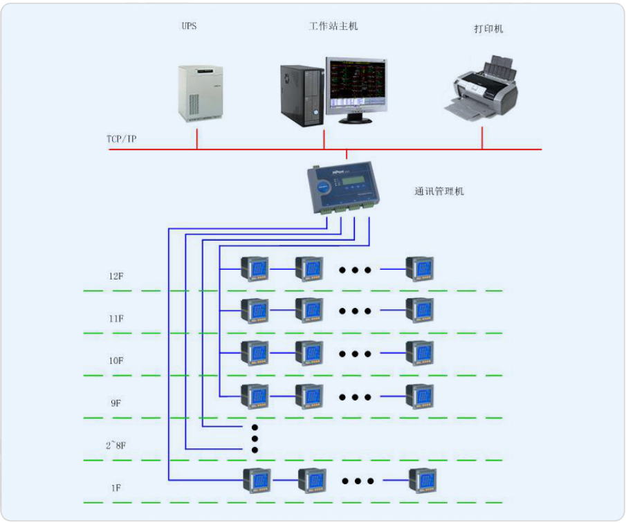 整個大樓采用兩路獨立的10KV高壓進線,經地下室10/0.4KV變配電所后供電,供電工作電壓為三相五線 380/220V。本工程地下室設置10/0.4KV變配電所,在樓層配電箱設分項計量,共48路計量節點,包括照明、插座、空調等,具體建設目標如下: