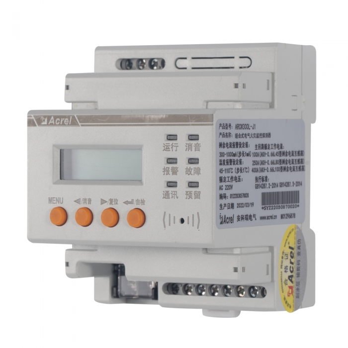 ARCM300L-J4:監(jiān)測四路剩余電流和一路溫度,四路繼電器輸出,聲光報警,485 通訊,事件記錄, LCD 顯示,1 路 RS485/MODBUS 通訊,導(dǎo)軌式安裝;