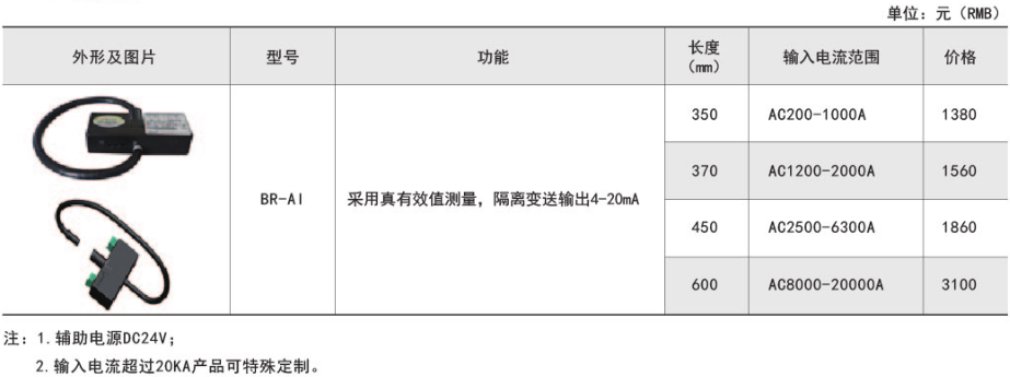 BR系列產(chǎn)品應(yīng)用電磁感應(yīng)原理,對電網(wǎng)中的交流大電流進(jìn)行實(shí)時(shí)測量,采用真有效值和線性補(bǔ)償技術(shù),將其隔離變換為標(biāo)準(zhǔn)的直流信號(hào)輸出。適用于冶金、電鍍、焊接等領(lǐng)域。具體型號(hào):BR-AI技術(shù)要求:輸入電流AC1...